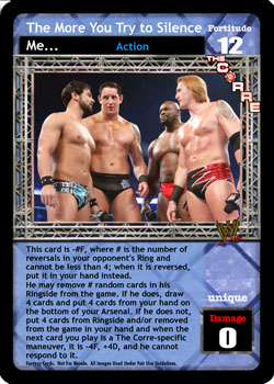 This card is -#F, where # is the number of reversals in your opponent's Ring and cannot be less than 4; when it is reversed, put it in your hand instead. He may remove # random cards in his Ringside from the game. If he does, draw 4 cards and put 4 cards from your hand on the bottom of your Arsenal. If he does not, put 4 cards from Ringside and/or removed from the game in your hand and when the next card you play is a The Corre-specific maneuver, it is -4F, +4D, and he cannot respond to it.