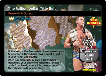 At the end of the Pre-match phase, you may search your Arsenal for 1 Throwback card, reveal it, put it in your hand, and shuffle. When you successfully play a Throwback maneuver, your opponent randomly reveals # cards from hand, where # is the number of Throwback cards in your Ring. Superstar Value +1