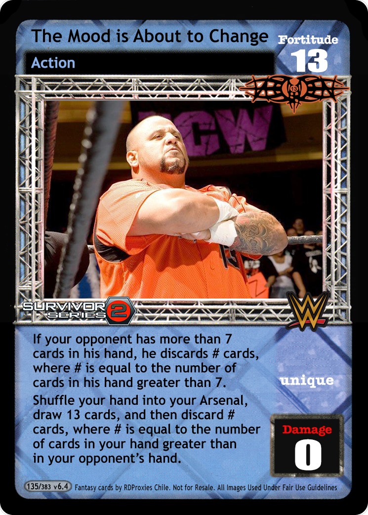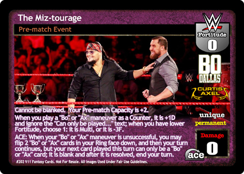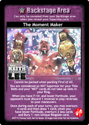 Cannot be packed when packing First of All. You are considered an NXT Superstar for your Title Belts and your NXT cards do not take up slots in your Ring. When you have F:10- and lower Fortitude, your opponent must discard 1 reversal to play reversals to your maneuvers. Once during each of your turns, you may overturn 4 cards and then draw 1 card; when you have lower Fortitude, overturn 2 less cards and Bury 1- non-Unique Ringside card.