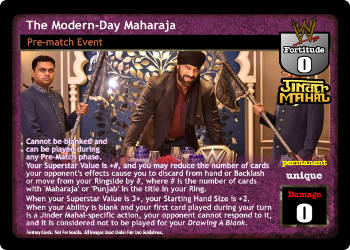 Cannot be blanked and can be played during any Pre-match phase. Your Superstar Value is +#, and you may reduce the number of cards your opponent's effects cause you to discard from hand or Backlash or move from your Ringside by #, where # is the number of cards with 'Maharaja' or 'Punjab' in the title in your Ring. When your Superstar Value is 3+, your Starting Hand Size is +2. When your Ability is blank and your first card played during your turn is a Jinder Mahal-specific action, your opponent cannot respond to it, and it is considered not to be played for your Drawing A Blank.