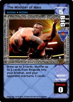 Draw up to 3 cards, shuffle up to 3 cards from Ringside into your Arsenal, and your opponent overturns 3 cards.