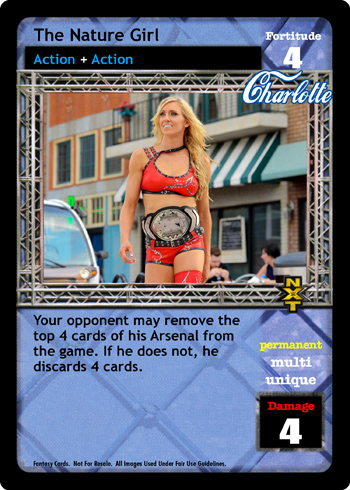 Your opponent may remove the top 4 cards of his Arsenal from the game. If he does not, he discards 4 cards.