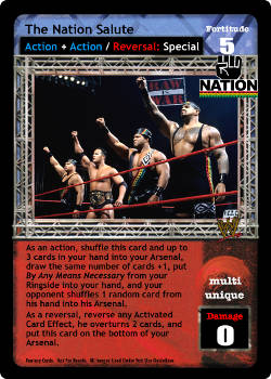 As an action, shuffle this card and up to 3 cards in your hand into your Arsenal, draw the same number of cards +1, put By Any Means Necessary from your Ringside into your hand, and your opponent shuffles 1 random card from his hand into his Arsenal. As a reversal, reverse any Activated Card Effect, he overturns 2 cards, and put this card on the bottom of your Arsenal.