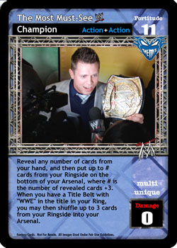 Reveal any number of cards from your hand, and then put up to # cards from your Ringside on the bottom of your Arsenal, where # is the number of revealed cards +3. When you have a Title Belt with 'WWE' in the title in your Ring, you may then shuffle up to 3 cards from your Ringside into your Arsenal.
