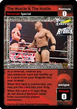 When you are Skip Sheffield, this card is +10F and +10D. As a reversal, reverse any non-maneuver card and shuffle up to 2 cards from your Ringside into your Arsenal. When this card is overturned, you may put this card into your Ring. When this card is in your Ring, do not discard Backlash cards from successfully played maneuvers.