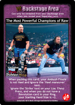 When packing this card, your Ambush Finale is not Heel, and disregard the µHeel maneuver' text. Ignore the 'Strike' text on your Lou Thesz Press, and wen you do not have a Revolution card in your Ring, your Starting Hand Size is +2.