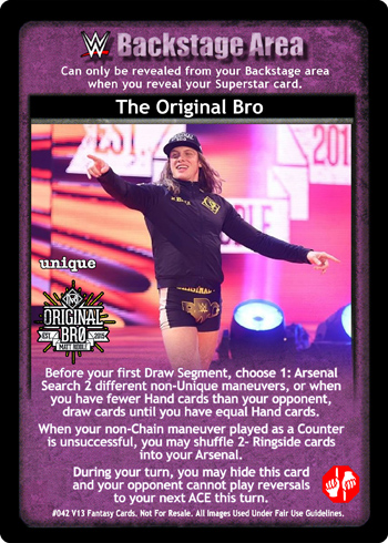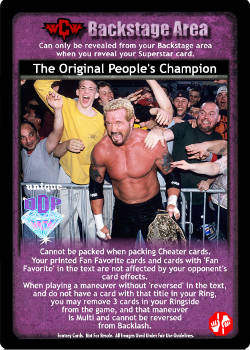 Cannot be packed when packing Cheater cards. Your printed Fan Favorite cards and cards with 'Fan Favorite' in the text are not affected by your opponent's card effects. When playing a maneuver without 'reversed' in the text, and do not have a card with that title in your Ring, you may remove 3 cards in your Ringside from the game, and that maneuver is Multi and cannot be reversed from Backlash.