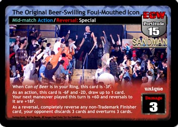 When Can of Beer is in your Ring, this card is -3F. As an action, this card is -6F and -2D, draw up to 1 card. Your next maneuver played this turn is +6D and reversals to it are +18F. As a reversal, completely reverse any non-Trademark Finisher card, your opponent discards 3 cards and overturns 3 cards.