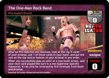 After all Pre-matches are resolved, look at the top 5 cards of your Arsenal, put 1 of those cards in your hand, and put the rest on the top and/or bottom of your Arsenal in any order. When you successfully play an antic or a non-multi action, and your next card played this turn is a non-Superstar-specific maneuver, it can only be reversed by D:0 reversals from hand and Arsenal.
