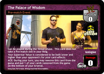 Can be played during the Venue phase. This card does not take a Pre-match slot in your Ring. Your Superstar Value is considered to be both lower and higher than your opponent's for your card effects. ACE: During your turn, you may remove this card from the game and put 1 of your cards removed from the game on the bottom of your Arsenal.