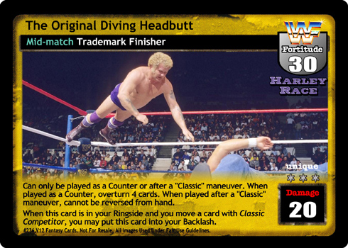 Can only be played as a Counter or after a 'Classic' maneuver. When played as a Counter, overturn 4 cards. When played after a 'Classic' maneuver, cannot be reversed from hand. When this card is in your Ringside and you move a card with Classic Competitor, you may put this card into your Backlash.
