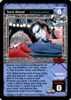 Search your Arsenal and Ringside for ...Is That Nothing's For Sure, reveal it, put it in your hand, and shuffle. ACE: Once during each of your turns, you may discard 1 card, and then look at the top 3 cards of your Arsenal; put up to 1 of those cards under a WCW card i your Ring with cards under it, up to 1 card into your hand, and remove the remaining cards from the game.