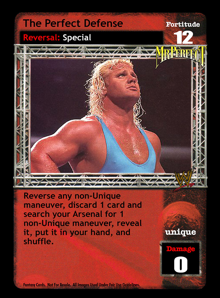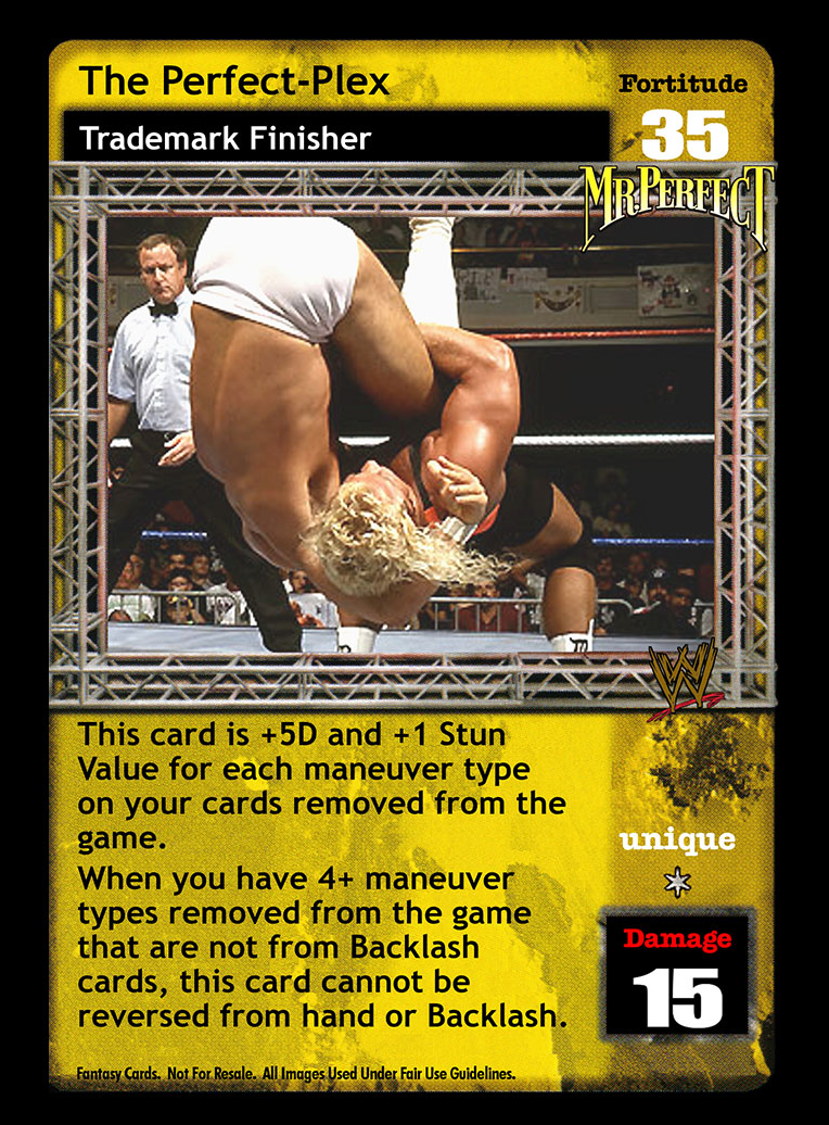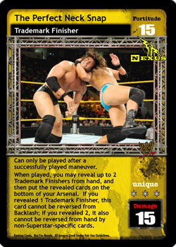 Can only be played after a successfully played maneuver. When played, you may reveal up to 2 Trademark Finishers from hand, and then put the revealed cards on the bottom of your Arsenal. If you revealed 1 Trademark Finisher, this card cannot be reversed from Backlash; if you revealed 2, it also cannot be reversed from hand by non-Superstar-specific cards.