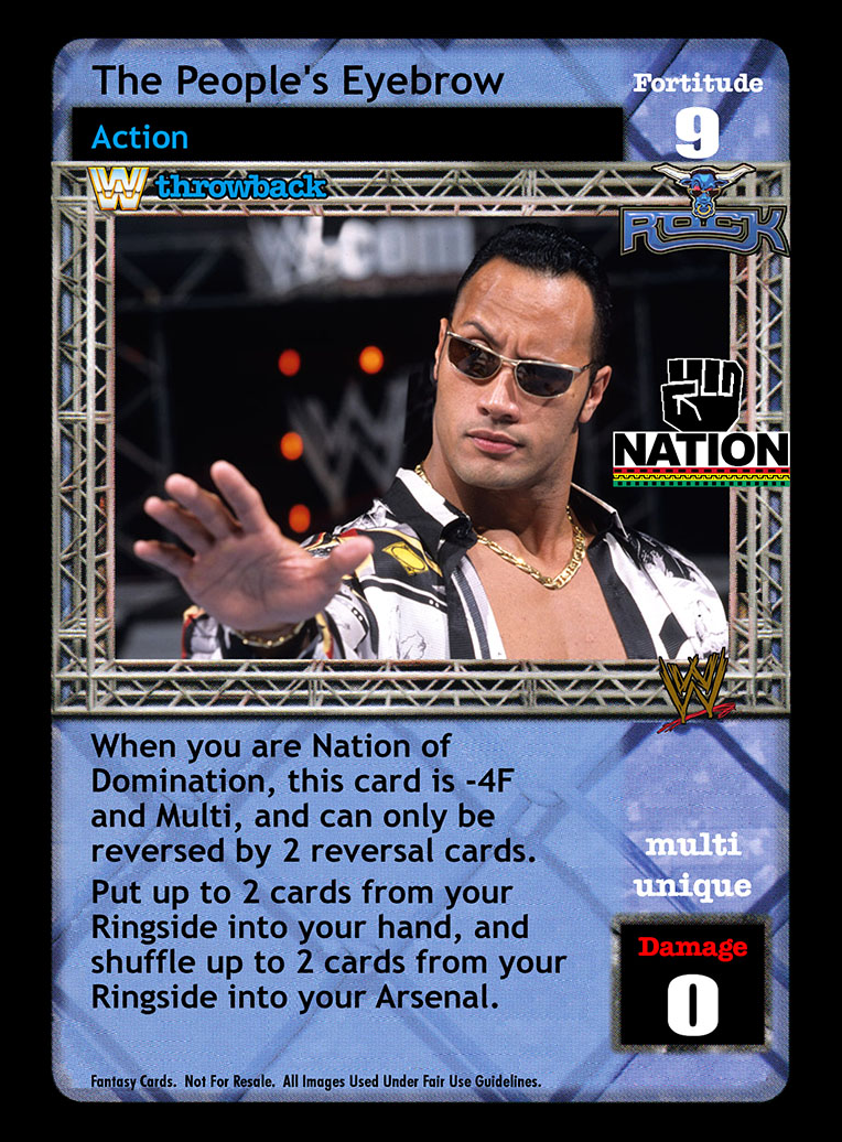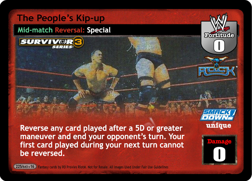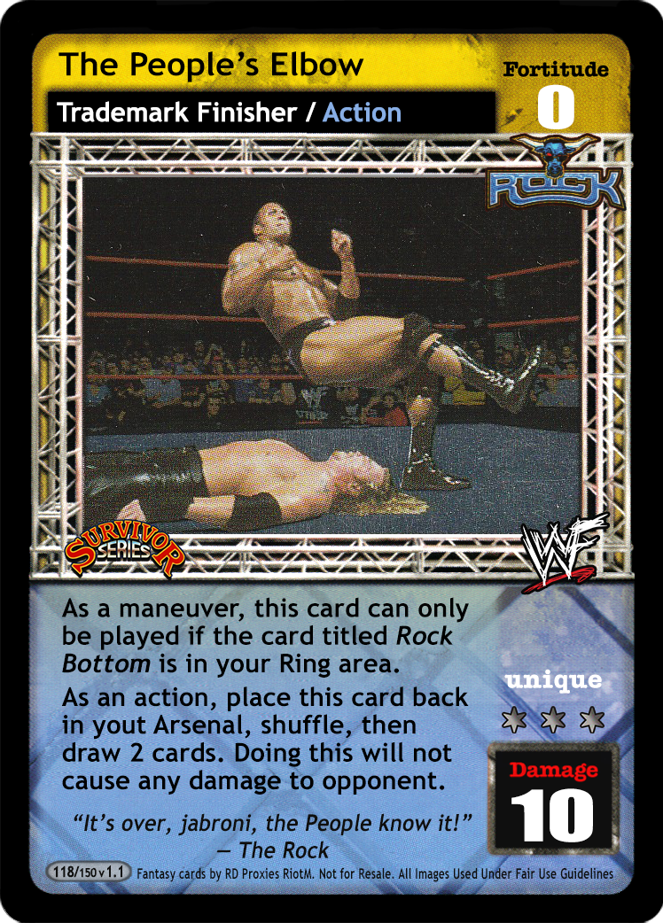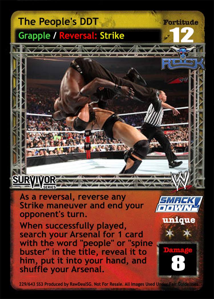 As a maneuver, can only be played when the card titled Rock Bottom or Spine Buster is in your Ring area. As an action, this card is -10D, shuffle this card into your Arsenal and draw 2 cards.