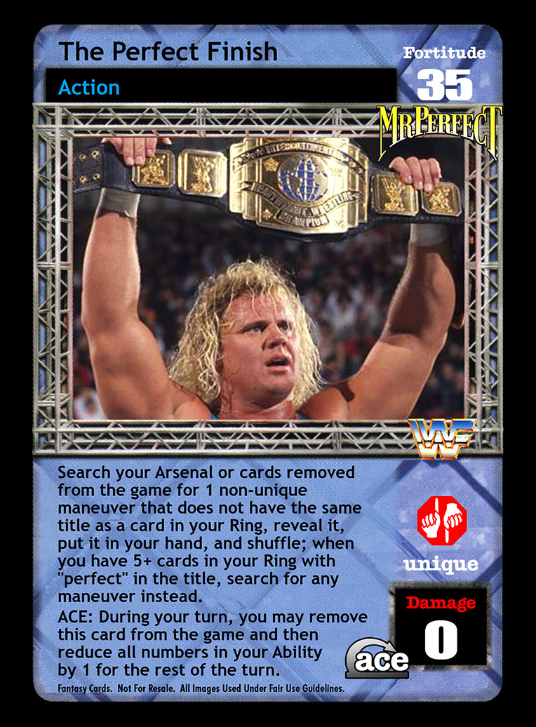 Search your Arsenal or cards removed from the game for 1 non-unique maneuver that does not have the same title as a card in your Ring, reveal it, put it in your hand, and shuffle your Arsenal; when you have 5 or more cards in the Ring with 'perfect' in the title, search for any 1 maneuver instead. ACE: During your turn, you may remove this card from the game and then reduce all numbers in your Ability by 1 for the rest of the turn.