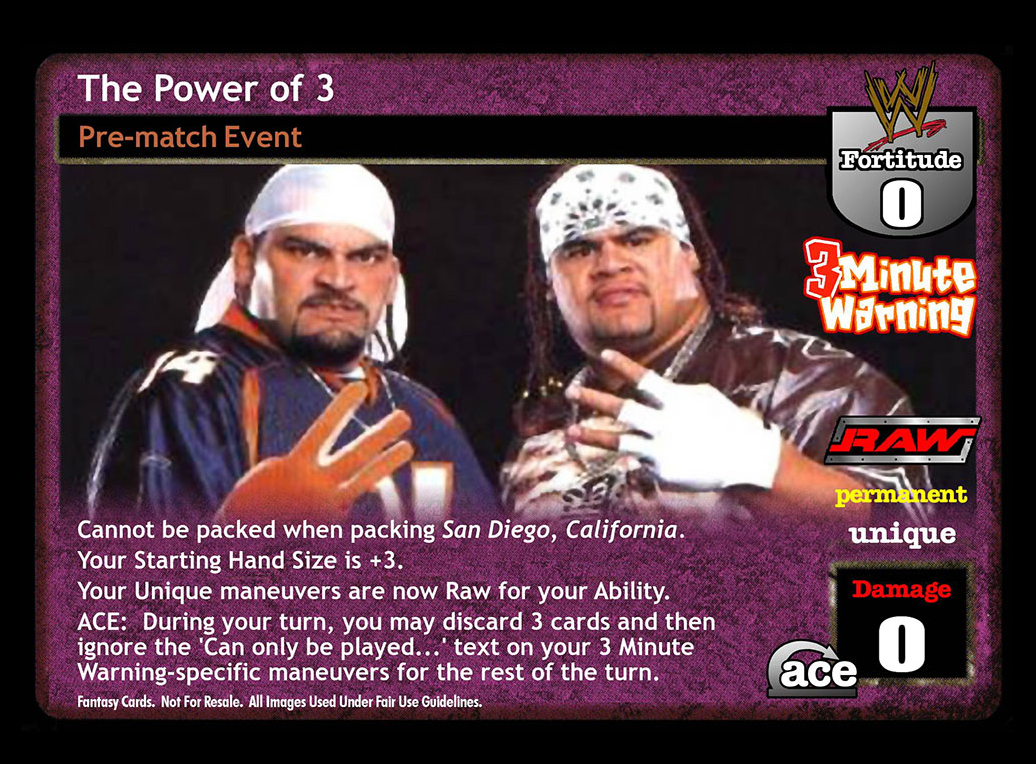 Cannot be packed when packing San Diego, California. Your Starting Hand Size is +3. Your Unique maneuvers are now Raw for your Ability. ACE: During your turn, you may discard 3 cards to ignore the 'Can only be played...' text on your 3 Minute Warning-specific maneuvers for the rest of your turn.