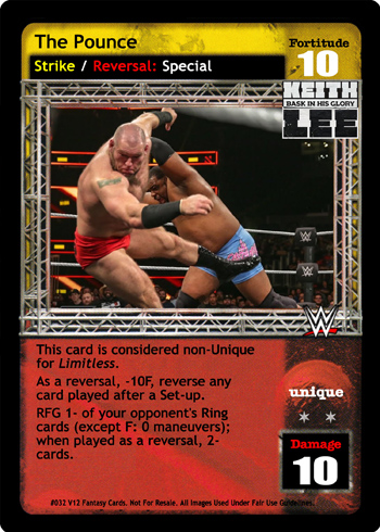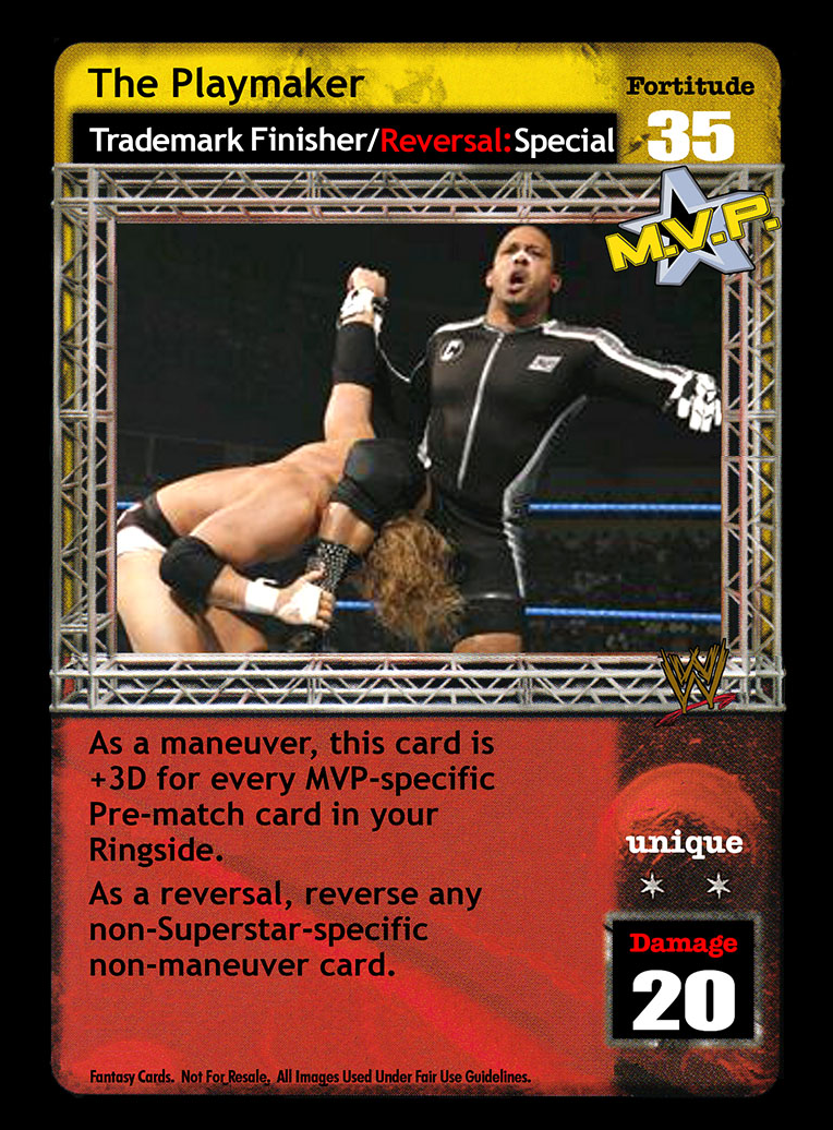 As a maneuver, this card is +3D for every MVP-specific Pre-match card in your Ringside. As a reversal, reverse any non-Superstar-specific non-Maneuver card.