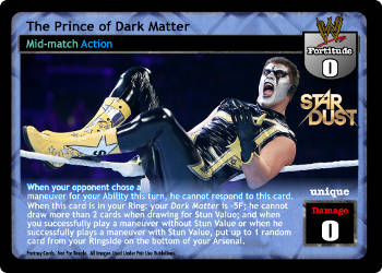 When your opponent choose a maneuver for your Ability this turn, he cannot respond to this card. When this card is in your Ring: your Dark Matter is -5F; he cannot draw more than 2 cards when drawing for Stun Value; and when you successfully play a maneuver without Stun Value or when he successfully plays a maneuver with Stun Value, put up to 1 random card from your Ringside on the bottom of your Arsenal.