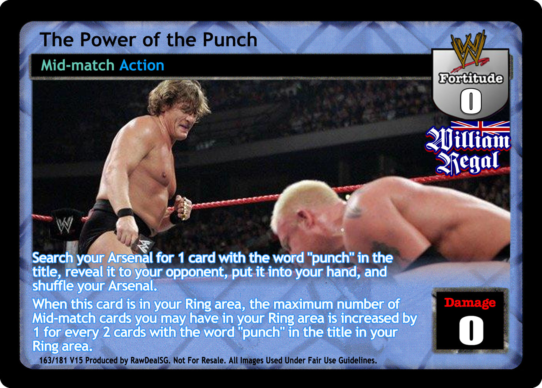 Search your Arsenal for 1 card with the word "punch" in the title, reveal it to your opponent, put it into your hand, and shuffle your Arsenal. When this card is in your Ring area, the maximum number of Mid-match cards you may have in your Ring area is increased by 1 for every 2 cards with the word "punch" in the title in your Ring area.