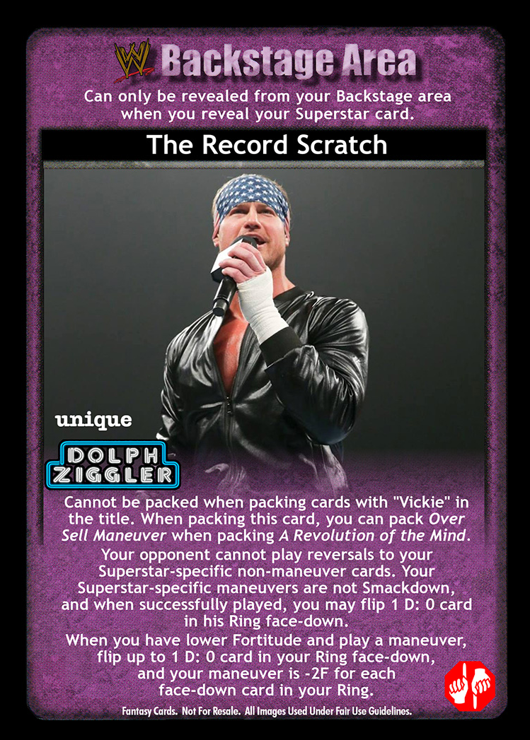 Cannot be packed when packing cards with 'Vickie' in the title. When packing this card, you can pack Over Sell Maneuver when packing A Revolution of the Mind. Your opponent cannot play reversals to your Superstar-specific non-maneuver cards. Your Superstar-specific maneuvers are not Smackdown, and when successfully played, you may flip 1 D: 0 card in his Ring face-down. When you have lower Fortitude and play a maneuver, flip up to 1 D: 0 card in your Ring face-down, and your maneuver is -2F for each face-down card in your Ring.