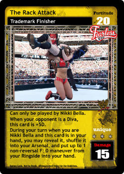 Can only be played by Nikki Bella. When your opponent is a Diva, this card is +5D. During your turn when you are Nikki Bella and this card is in your hand, you may reveal it, shuffle it into your Arsenal, and put up to 1 non-reversal F: 0 maneuver from your Ringside into your hand.