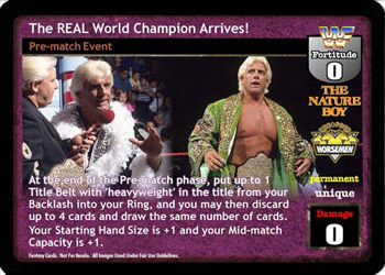 At the end of the Pre-match phase, put up to 1 Title Belt with 'heavyweight' in the title from your Backlash into your Ring, and you may then discard up to 4 cards and draw the same number of cards. Your Starting Hand Size is +1 and your Mid-match Capacity is +1.