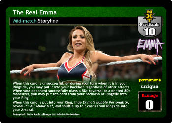 When this card is unsuccessful, or during your turn when it is in your Ringside, you may put it into your Backlash regardless of other effects. When your opponent successfully plays a 5D+ reversal or a printed 8D+ maneuver, you may put this card from your Backlash or Ringside into your Ring. When this card is put into your Ring, hide Emma's Bubbly Personality, reveal It's All About Me!, and shuffle up to 5 cards from Ringside into your Arsenal.