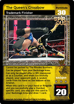 Cannot be packed by The Rhodes Brothers. Can be played from your Backstage Area. Can only be played after a 3D+ maneuver or as a Counter, and when successfully played, your opponent puts 4 random cards from his hand on the bottom of his Arsenal. When this card is in your hand or Ringside and you successfully play a Stardust-specific card, you may put this card in your Backstage Area and draw 1 card.