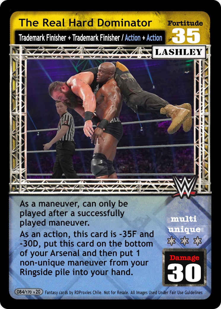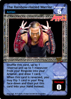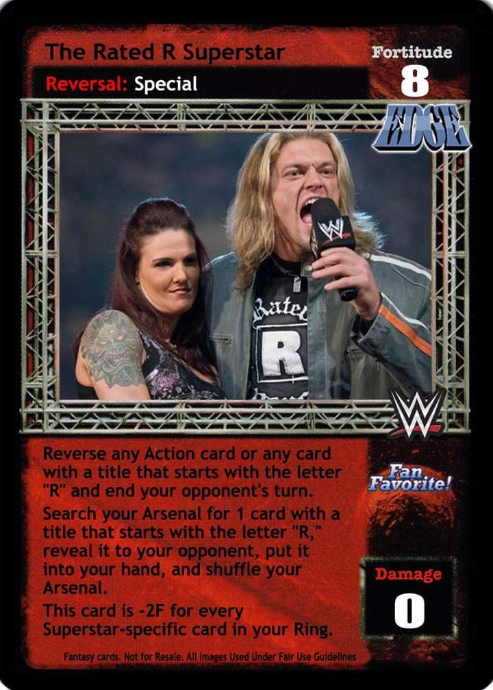 Reverse any Action card or any card with a title that starts with the letter "R" and end your opponent's turn. Search your Arsenal for 1 card with a title that starts with the letter "R," reveal it to your opponent, put it into your hand, and shuffle your Arsenal. This card is -2F for every Superstar-specific card in your Ring area.