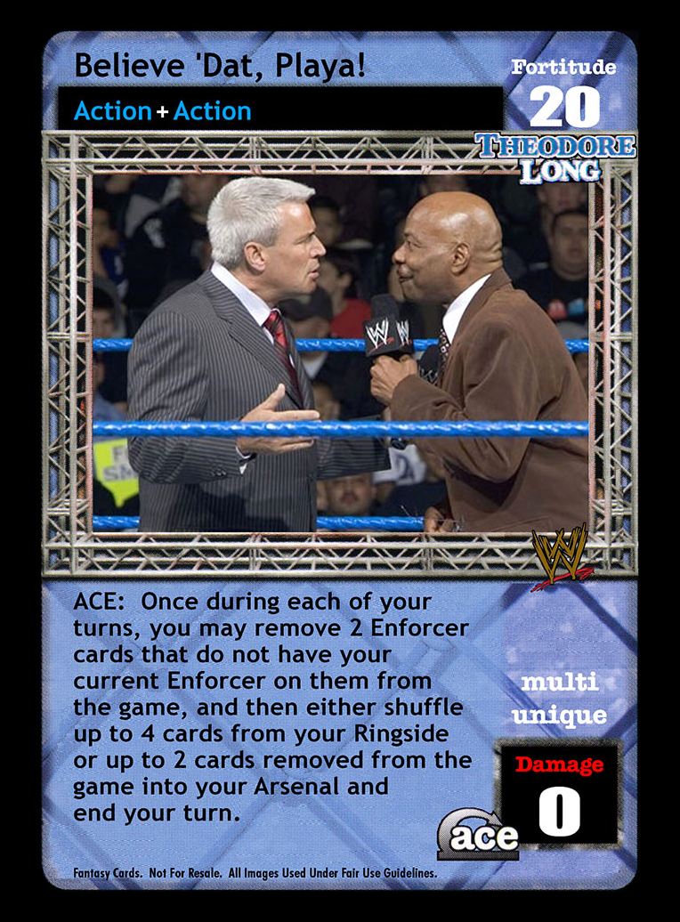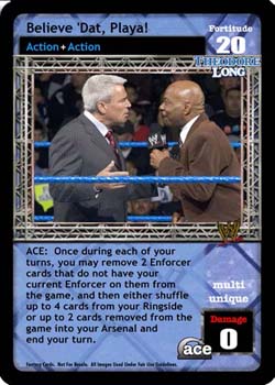 ACE: Once during each of your turns, you may remove 2 Enforcer cards that do not have your current Enforcer on them from the game, and then either shuffle up to 4 cards from your Ringside or up to 2 cards removed from the game into your Arsenal and end your turn.