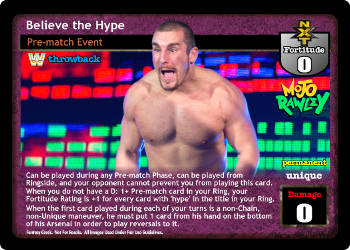 Can be played during any Pre-match Phase, can be played from Ringside, and your opponent cannot prevent you from playing this card. When you do not have a D: 1+ Pre-match card in your Ring, your Fortitude Rating is +1 for every card with 'hype' in the title in your Ring. When the first card played during your turn is a non-Chain, non-Unique maneuver, your opponent must put 1 card from his hand on the bottom of his Arsenal in order to play reversals to it.