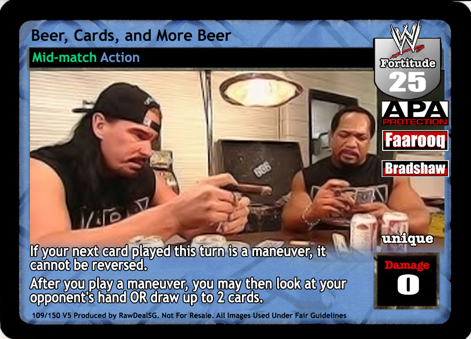 Can only be played as a Counter, or after a successfully played maneuver or Becky Lynch-specific card. When played, overturn up to 5 cards. This card is -1F for every card overturned. Can only be reversed from Arsenal.