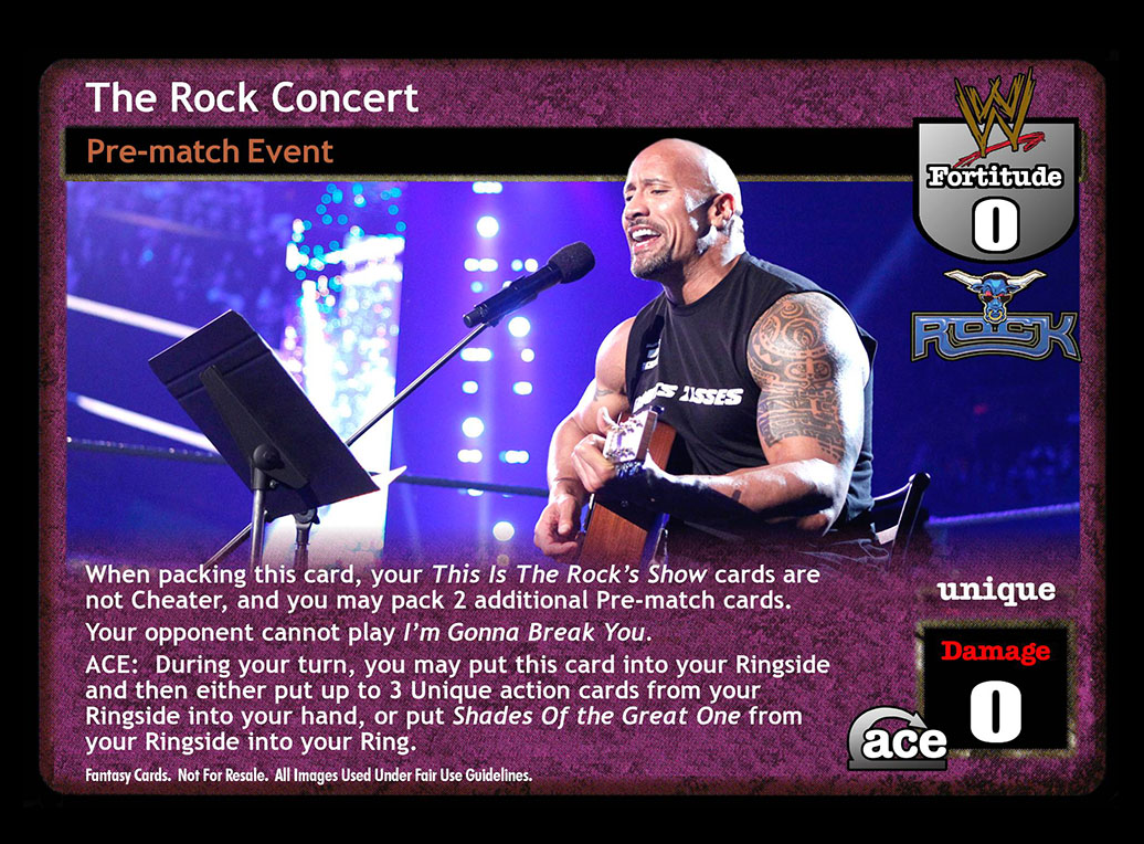 When packing this card, your This Is The Rock's Show cards are not Cheater, and you may pack 2 additional Pre-match cards. Your opponent cannot play I'm Gonna Break You. ACE: During your turn, you may put this card into your Ringside and then either put up to 3 Unique action cards from your Ringside into your hand, or put Shades Of the Great One from your Ringside into your Ring.