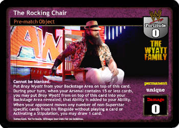 Cannot be blanked. Put Bray Wyatt from your Backstage Area on top of this card. During your turn, when your Arsenal contains 15 or less cards, you may put Bray Wyatt from on top of this card into your Backstage Area revealed; that Ability is added to your Ability. When your opponent moves any number of non-Superstar-specific cards from his Ringside without playing a card or Activating a Stipulation, you may draw 1 card.