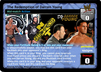 When your Fortitude Rating is 5 or less and your maneuver is unsuccessfully played, you may put this card from your Backlash into your opponent's Ring. When this card is in your Ring, you cannot play reversals from hand unless you discard 1 Backlash reversal card; when you are Darren Young, discard any Backlash card instead. When this card is in your Ring and your opponent reverses a card from hand, put this card into his Ring.