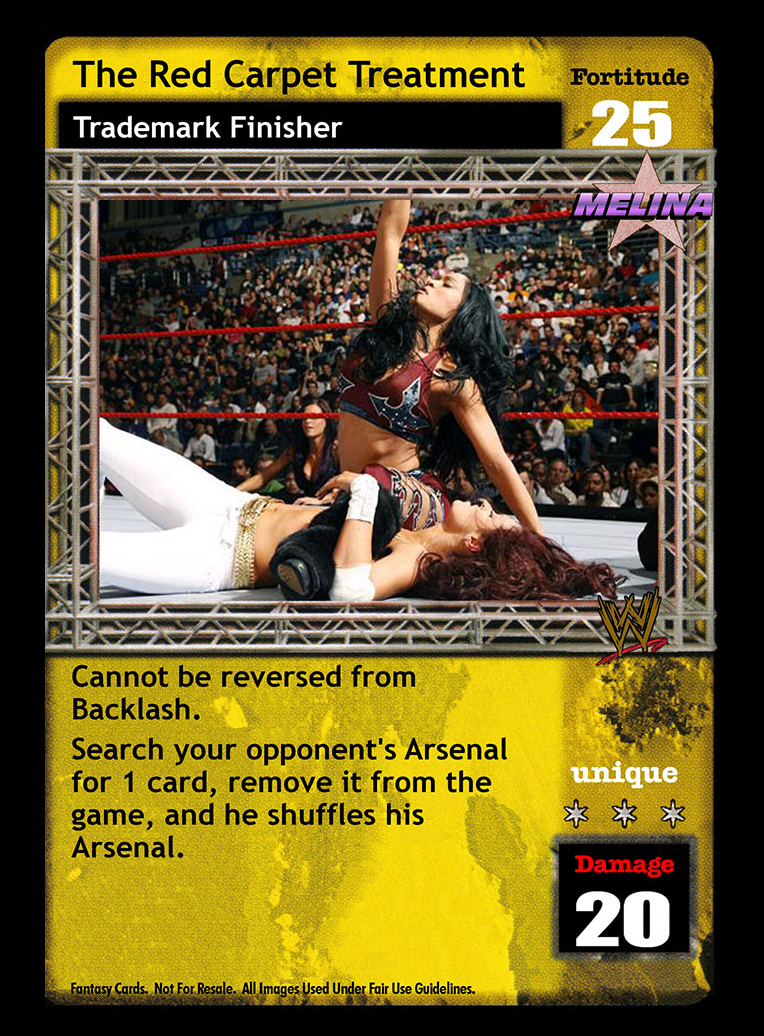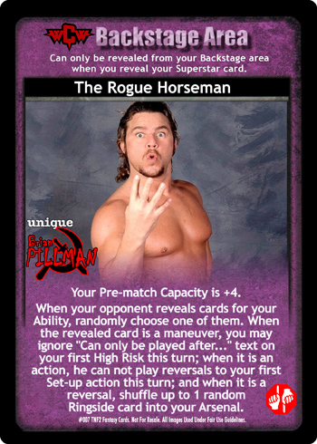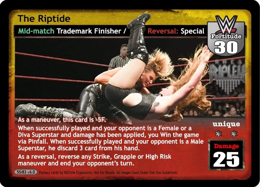 As a maneuver, this card is -10F. When successfully played and your opponent is a female or a diva superstar and damage has been applied, you win the game via pinfall. When successfully played and you opponent is a male superstar, he discards 3 cards from his hand As a reversal, reverse any Grapple or High Risk maneuver and end your opponent`s turn
