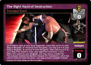 Once before each of your Draw Segments, when this card is in your Ring or Ringside, or removed from the game, you may put it in your Ring or Ringside, or remove it from the game; when you move it to your Ring from another area, your opponent overturns 1 card. When this card is in your Ringside, you may reveal a Strike for The Samoan Submission Machine instead of a Submission; when this card is removed from the game, you may reveal a Grapple instead.