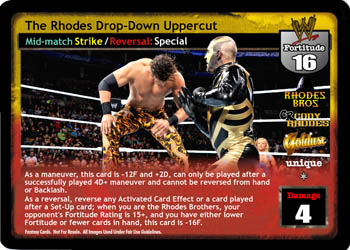 As a maneuver, this card is -12F and +2D, can only be played after a successfully played 4D+ maneuver and cannot be reversed from hand or Backlash. As a reversal, reverse any Activated Card Effect or a card played after a Set-Up card; when you are the Rhodes Brothers, your opponent's Fortitude Rating is 15+, and you have either lower Fortitude or fewer cards in hand, this card is -16F.
