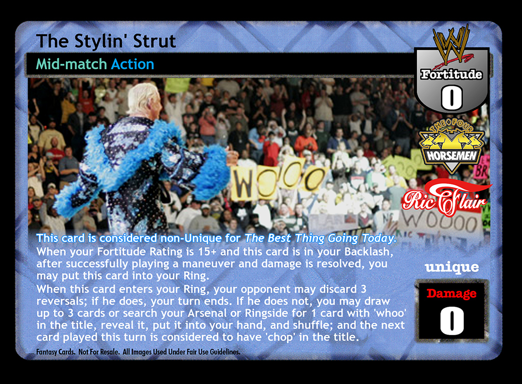 This card is considered non-Unique for The Best Thing Going Today.When your Fortitude Rating is 15+ and this card is in your Backlash, after successfully playing a maneuver and damage is resolved, you may put this card into your Ring. When this card enters your Ring, your opponent may discard 3 reversals; if he does, your turn ends. If he does not, you may draw 3 cards or search your Arsenal or Ringside for a card with 'whoo' in the title, reveal it, put it into your hand, and shuffle; and the next card played this turn is considered to have 'chop' in the title.