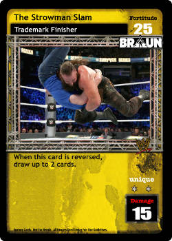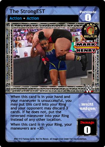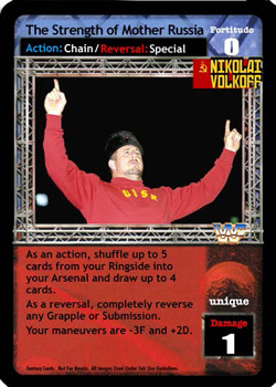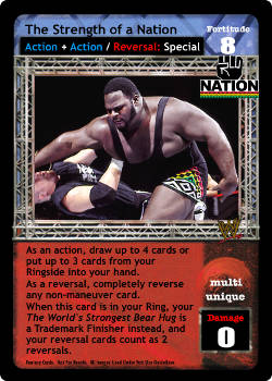 As an action, draw up to 4 cards or put up to 3 cards from your Ringside into your hand. As a reversal, completely reverse any non-maneuver card. When this card is in your Ring, your The World's Strongest Bear Hug is a Trademark Finisher instead, and your reversal cards count as 2 reversals.