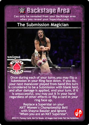 Once during each of your turns, you may flip a Submission in your Ring face down. If you do, your next maneuver played from hand this turn is considered to be a Submission with blank text, and after damage is applied, end your turn. If it is unsuccessful, you may put it in your hand regardless of other effects or flip a card in your Ring face up. Replace a Superstar on your NXT Women's Championship Belt with Shayna Baszler and ignore 'When you are an NXT Superstar'.