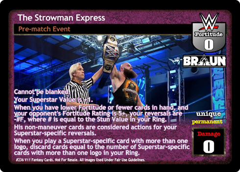 When you have lower Fortitude or fewer cards in hand, and your opponent's Fortitude Rating is 5+, your reversals are -#F, where # is equal to the Stun Value in your Ring. His non-maneuver cards are considered actions for your reversals. When you play a reversal or Superstar-specific card with more than one logo, discard cards equal to the number of Superstar-specific card with more than one logo in your Ring.