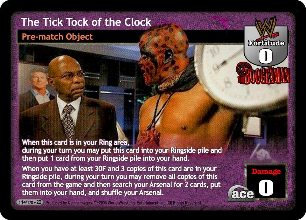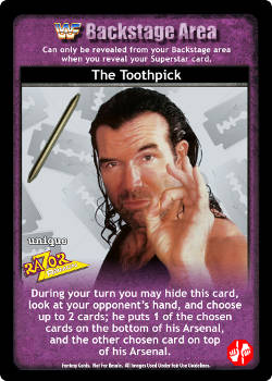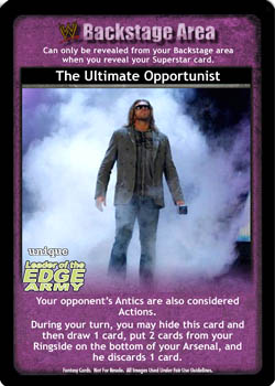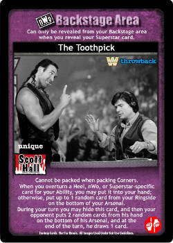Cannot be packed when packing Corners. When you overturn a Heel, nWo, or Superstar-specific card for your Ability, you may put it into your hand; otherwise, put up to 1 random card from your Ringside on the bottom of your Arsenal. During your turn you may hide this card, and then your opponent puts 2 random cards from his hand on the bottom of his Arsenal, and at the end of the turn, he draws 1 card.