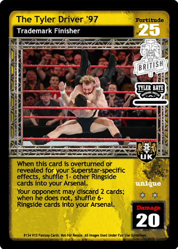 When this card is overturned or revealed for your Superstar-specific effects, shuffle 1- other Ringside cards into your Arsenal. Your opponent may discard 2 cards; when he does not, shuffle 6- Ringside cards into your Arsenal.