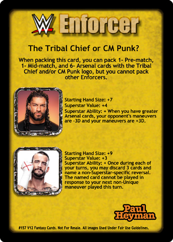 When packing this card, you can pack 1- Pre-match, 1- Mid-match, and 6- Arsenal cards with the Tribal Chief and/or CM Punk logo, but you cannot pack other Enforcers. • Starting Hand Size: +7 Superstar Value: +4 Superstar Ability: + When you have greater Arsenal cards, your opponent's maneuvers are -3D and your maneuvers are +3D. • Starting Hand Size: +9 Superstar Value: +3 Superstar Ability: + Once during each of your turns, you may discard 3 cards and name a non-Superstar-specific reversal. The named card cannot be played in response to your next non-Unique maneuver played this turn.