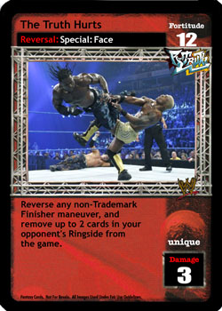 Reverse any non-Trademark Finisher maneuver, and remove up to 2 cards in your opponent's Ringside from the game.