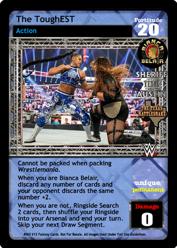 Cannot be packed when packing Wrestlemania. When you are Bianca Belair, discard any number of cards and your opponent discards the same number +2. When you are not, Ringside Search 2 cards, then shuffle your Ringside into your Arsenal and end your turn. Skip your next Draw Segment.