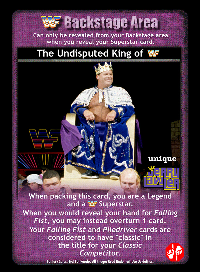 When packing this card, you are a Legend and a (Classic WWF) Superstar. When you would reveal your hand for Falling Fist, you may instead overturn 1 card. Your Falling Fist and Piledriver are considered to have 'classic' in the title for your Classic Competitor.