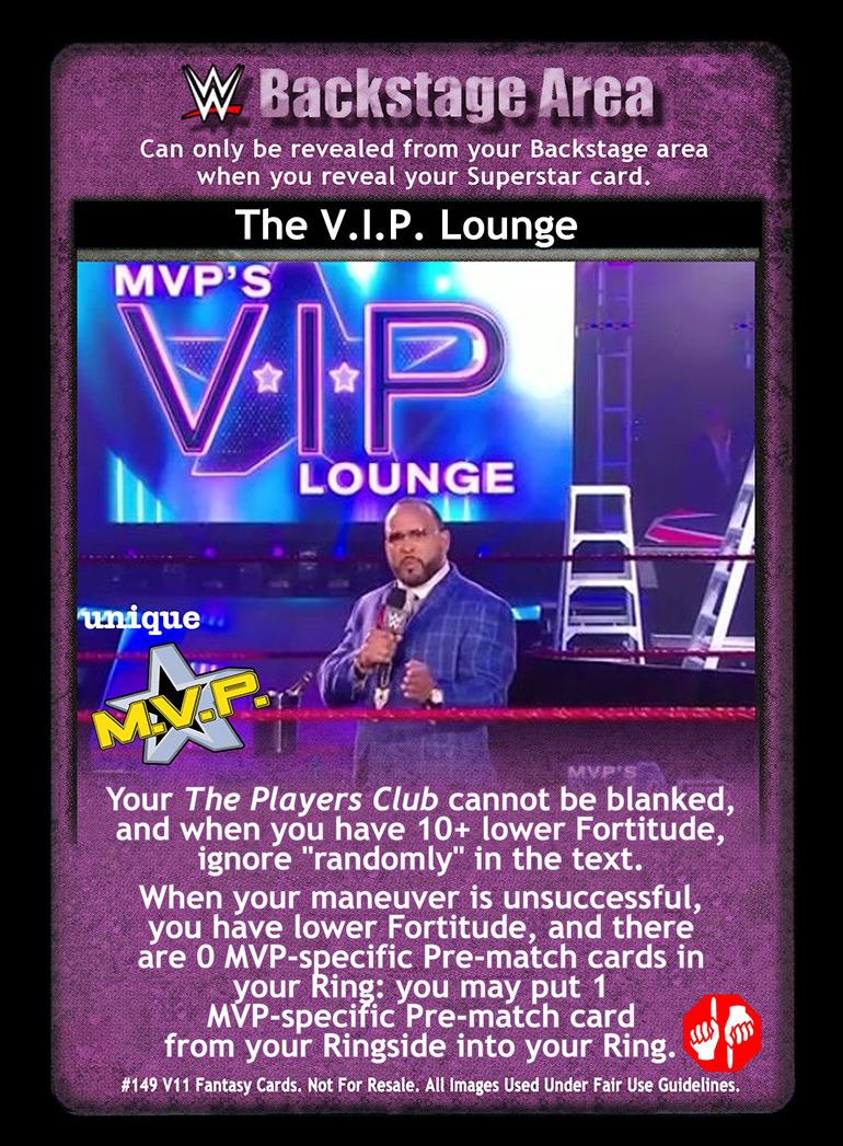 Your The Players Club cannot be blanked, and when you have 10+ lower Fortitude, ignore 'randomly' in the text. When your maneuver is unsuccessful, you have lower Fortitude, and there are 0 MVP-specific Pre-match cards in your Ring: you may put 1 MVP-specific Pre-match card from your Ringside into your Ring.