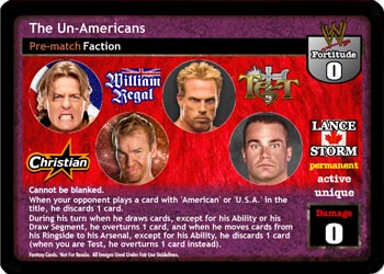 Cannot be blanked. When your opponent plays a card with 'American' or 'U.S.A.' in the title, he discards 1 card. During his turn when he draws cards, except for his Ability or his Draw Segment, he overturns 1 card, and when he moves cards from his Ringside to his Arsenal, except for his Ability, he discards 1 card (when you are Test, he overturns 1 card instead).